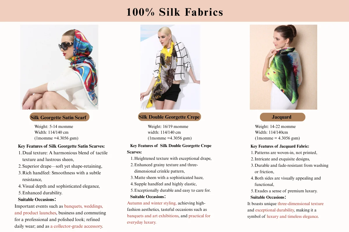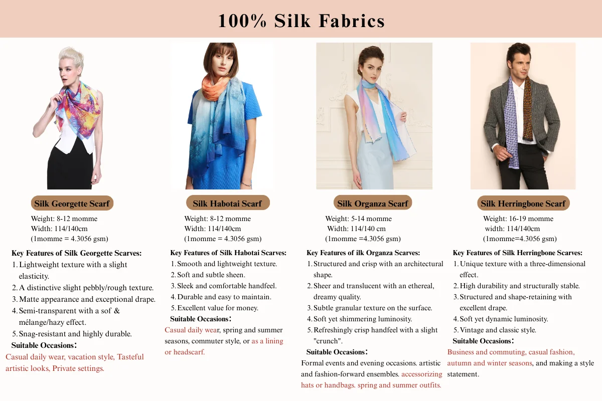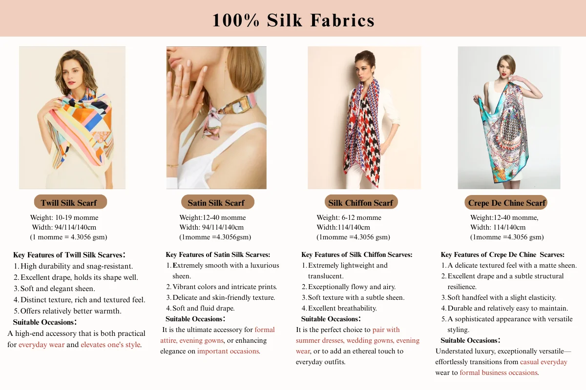 Key Features of Twill Silk ScarvesHigh durability and snag-resistant.Excellent drape, holds its shape well.Soft and elegant sheen.Distinct texture, rich and textured feel.Offers relatively better warmth.Suitable Occasions:A high-end accessory that is both practical for everyday wear and elevates one's style.Satin Silk Scarves.Extremely smooth with a luxurious sheen.Vibrant colors and intricate prints.Delicate and skin-friendly texture.Soft and fluid drape.Suitable Occasions:It is the ultimate accessory for formal attire, evening gowns, or enhancing elegance on important occasions.Silk Chiffon Scarves:Extremely lightweight and translucent.Exceptionally flowy and airy.Soft texture with a subtle sheen.Excellent breathability.It is the perfect choice to pair with summer dresses, wedding gowns, evening wear, or to add an ethereal touch to everyday outfits.